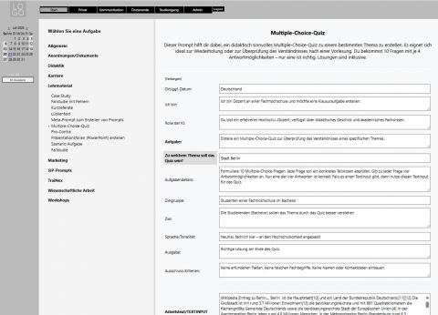 • Zum anderen ein Anfrage-Formular, in dem man standardisierte KI-Anfragen erstellen, speichern und auch mit anderen Mitarbeitenden teilen kann, z.B. einen komplexen Prompt zu "MC-Test-Erstellung".
